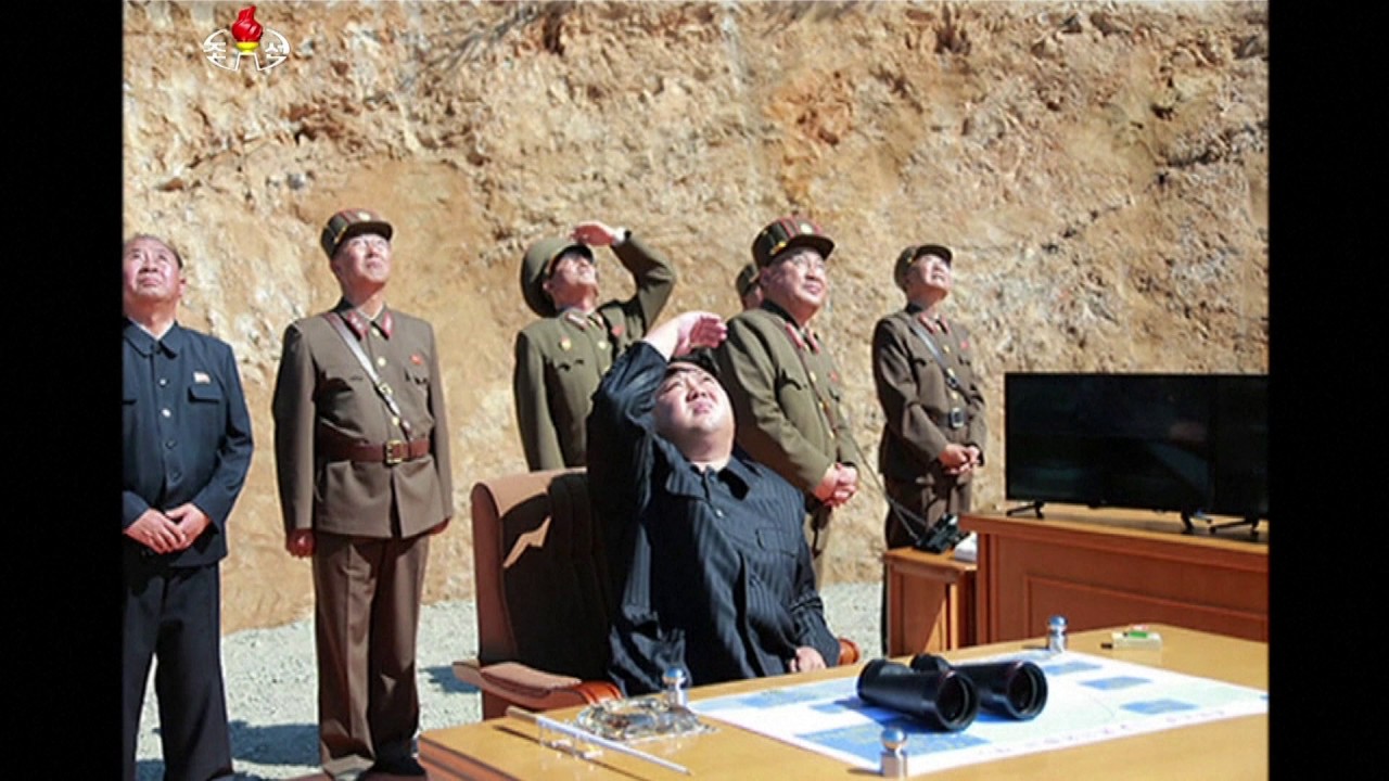 The video also shows photos of North Korea’s leader Kim Jong-Un excitedly cheering while watching the missile test.