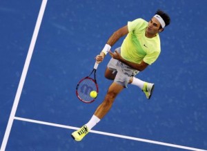 Roger Federer of Switzerland hits a return against Lu Yen-Hsun of Taiwan during their men’s singles first round match at the Australian Open 2015 tennis tournament in Melbourne January 19, 2015. REUTERS/Carlos Barria