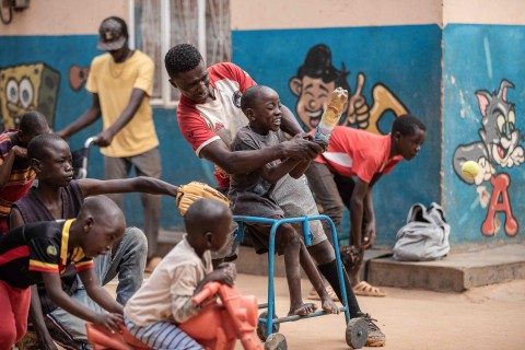 TOPSHOT – Ugandan baseball player Dennis Kasumba (C), 18, who dreams of becoming Uganda’s first US Major League Baseball (MLB) player plays with a child at St. Lilian Jubilee Home for disabled and disadvantaged children as baseball players’ weekly visit to the church-run home in Gayaza, Uganda on May 22, 2023. Noticed online after videos of his talent and creativity went viral, Dennis Kasumba received an invitation to the Major League Baseball (MLB) Draft League, which starts on June 1 in the United States. (Photo by BADRU KATUMBA / AFP)