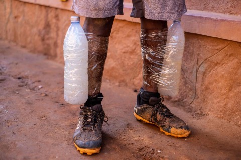 Puffing away in the equatorial sun, Kasumba runs through squats using barbells made of concrete and discarded car tyres, with water-filled plastic bottles taped to his legs for resistance.