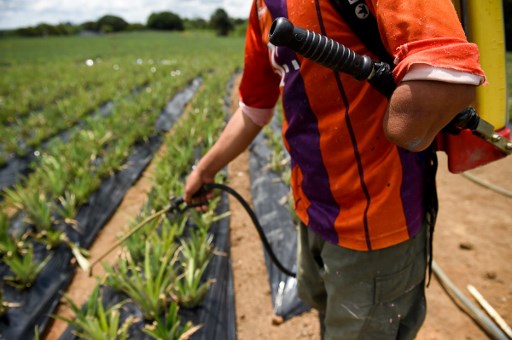 An anti-personnel mine tore off Salcedo’s left arm, he explains as he sprays pesticides at the plantation of 20,000 young pineapple plants.