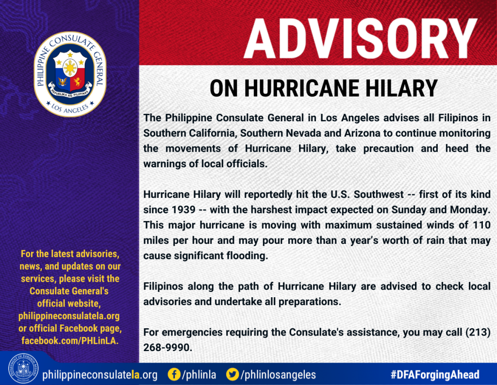The Philippine Consulate in Los Angeles is urging all Filipinos in Southern California, Southern Nevada, and Arizona to be prepared for the potential impact of Hurricane Hilary.