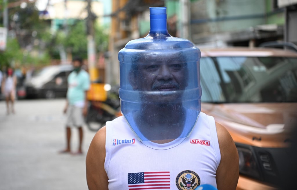 (Eagle News) — Amid the shortage of face shields and face masks, this resident in Manila made his own version of this personal protective equipment (PPE) — a plastic water tank to protect himself.