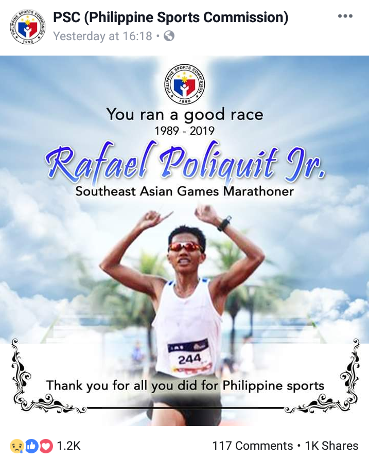 (Eagle News) — Filipino marathoner Rafael Poliquit Jr. has passed away.