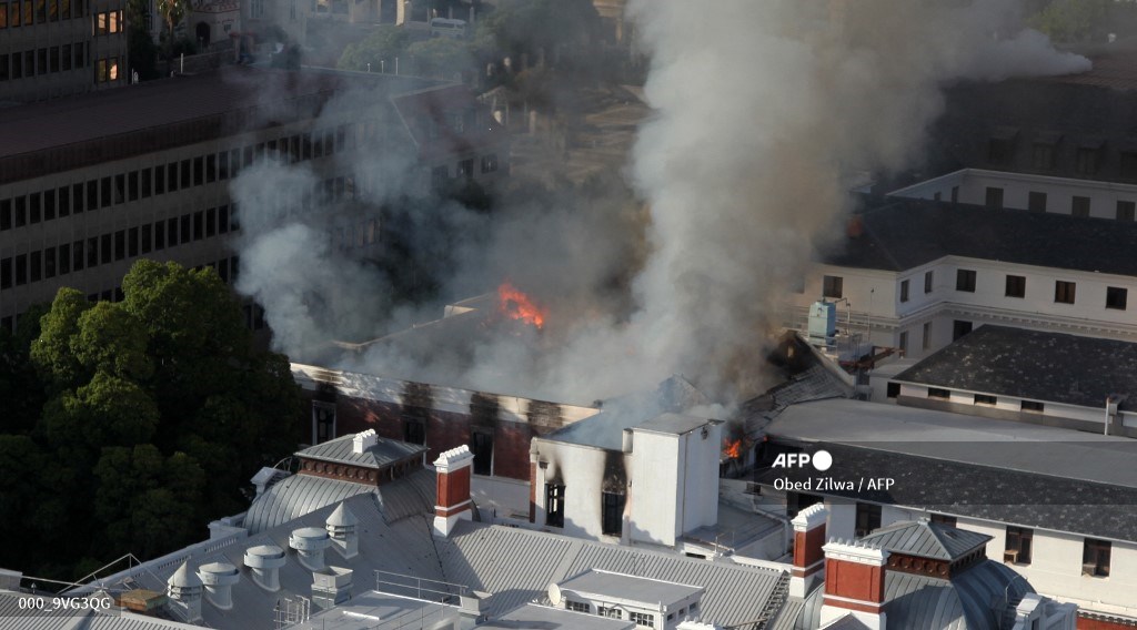 A major fire broke out at South Africa’s seat of parliament in Cape Town early Sunday, sending a thick column of smoke into the sky and threatening the National Assembly building.
