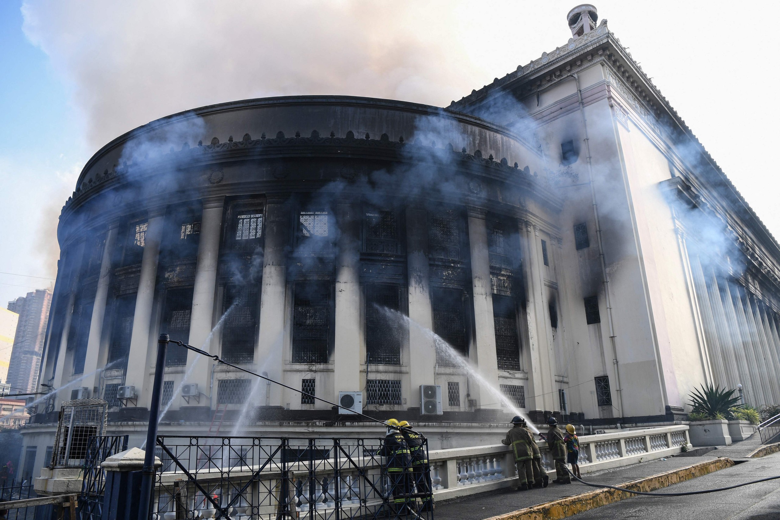 Thick, black smoke billowed hundreds of metres into the sky as flames gutted the neo-classical Manila Central Post Office that overlooks the Pasig River.