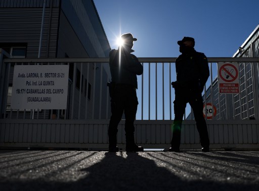 Civil guards watch the entrance of a warehouse in Cabanillas del Campo, Guadalajara province, where the first batch of the Pfizer-BioNTech Covid-19 vaccine is stored after arriving from Belgium, on December 26, 2020.. (Photo by OSCAR DEL POZO / AFP)
