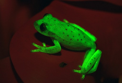 Under normal light the frog’s translucent skin is a muted yellowish-brown color with red dots, but when the scientists shone an ultraviolet light on it, it turned a celestial green.