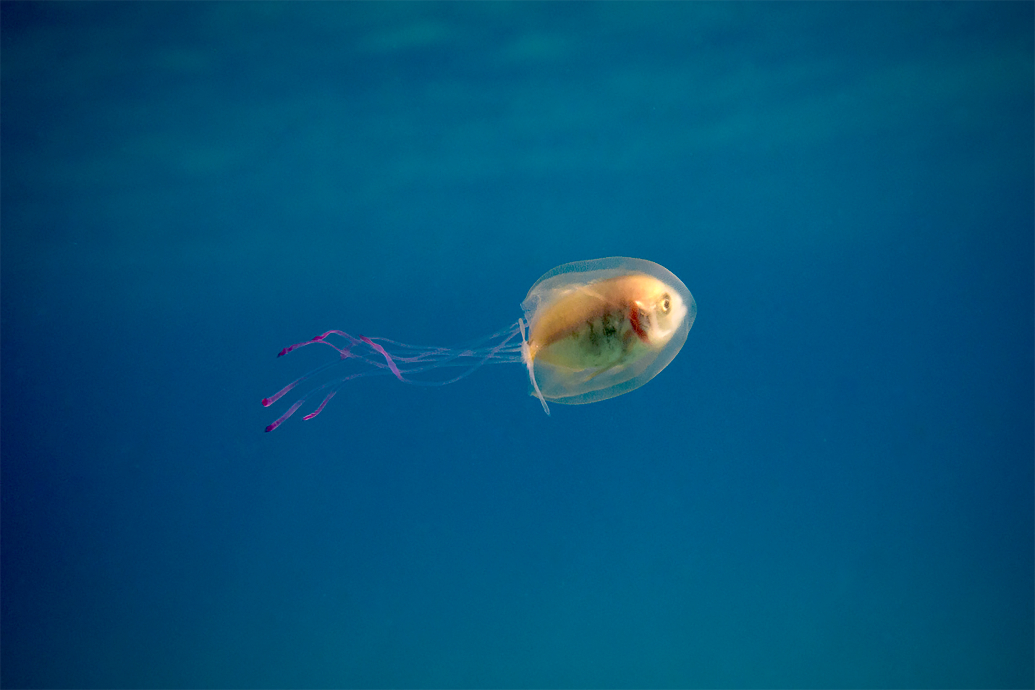 The expression on the golden fish’s face — visible through the transparent jellyfish — appears to be one of fear.