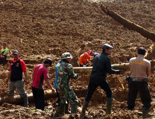 Members of a rescue team join villagers as they search for victims of a landslide triggered by a heavy rain in Brebes, Central Java province, on February 23, 2018.