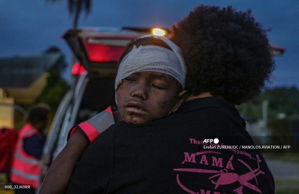This handout photo taken and received from Manolos Aviation on September 11, 2022, shows injured villagers arriving at a hospital in Lae after being evacuated by helicopter from Wauko Village following a 7.6-magnitude quake which struck off Papua New Guinea’s coast. (Photo by Erebiri ZURENUOC / MANOLOS AVIATION / AFP)