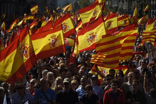 Ten of thousands of flag-waving demonstrators packed central Barcelona to rally against plans by separatist leaders to declare Catalonia independent following a banned secession referendum. Catalans calling themselves a “silent majority” opposed to leaving Spain broke their silence after a week of mounting anxiety over the country’s worst political crisis in a generation.
