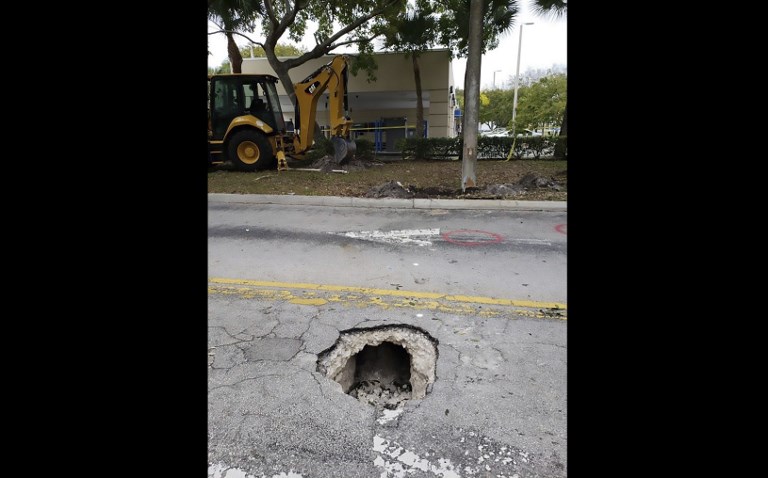 MIAMI, United States (AFP) — Road workers in Florida sent out to repair a sinkhole got a surprise this week when they discovered it was caused by a tunnel leading to a nearby bank.