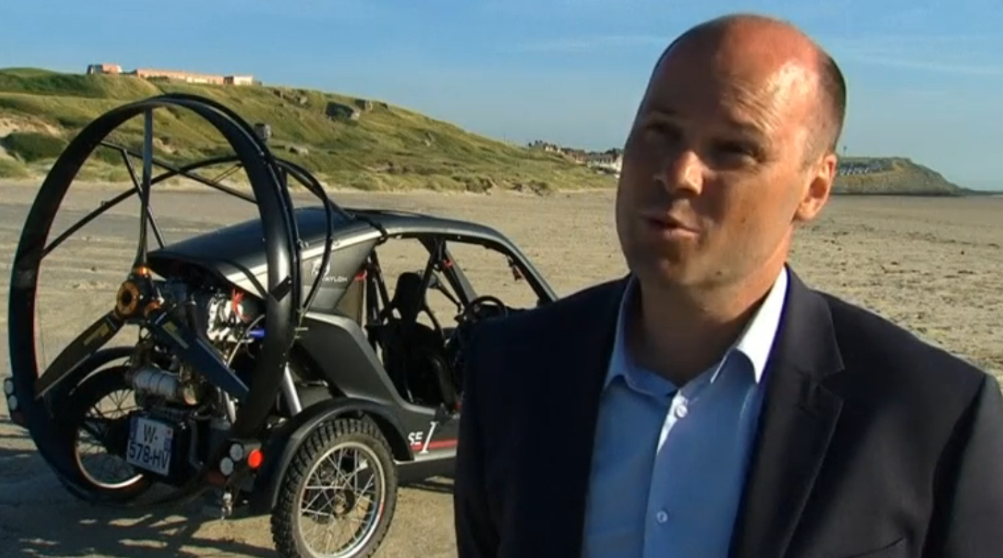 He described the vehicle – a kind of dune buggy with a paraglider’s propeller, which requires and a driving and a pilot license – as very light with ‘off-road capacities’ and able to fly over obstacles.