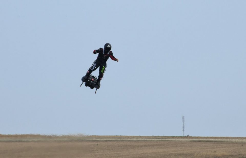 Zapata’s flyboard, which is about the size of a skateboard, is powered by five small jet engines that allow the rider to fly at speeds of 190 kilometers an hour (118 mph).
