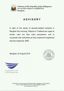 (Eagle News)–The Philippine Embassy in Bangkok on Friday, Aug. 2, urged Filipinos there to take extra precautions following the “bombings” that ripped across the capital as it hosted a regional summit.