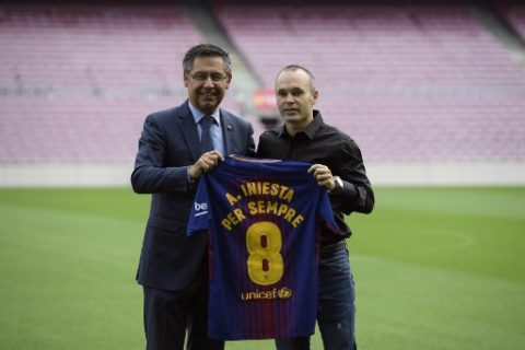 Barcelona tied down captain Andres Iniesta for the rest of his career as the club announced the 33-year-old midfielder has agreed a “lifetime contract”. Normally determined to shy away from the spotlight, Iniesta spoke out to urge negotiation and prevent a spiralling political crisis over the battle for Catalan independence deepening. / AFP PHOTO / LLUIS GENE