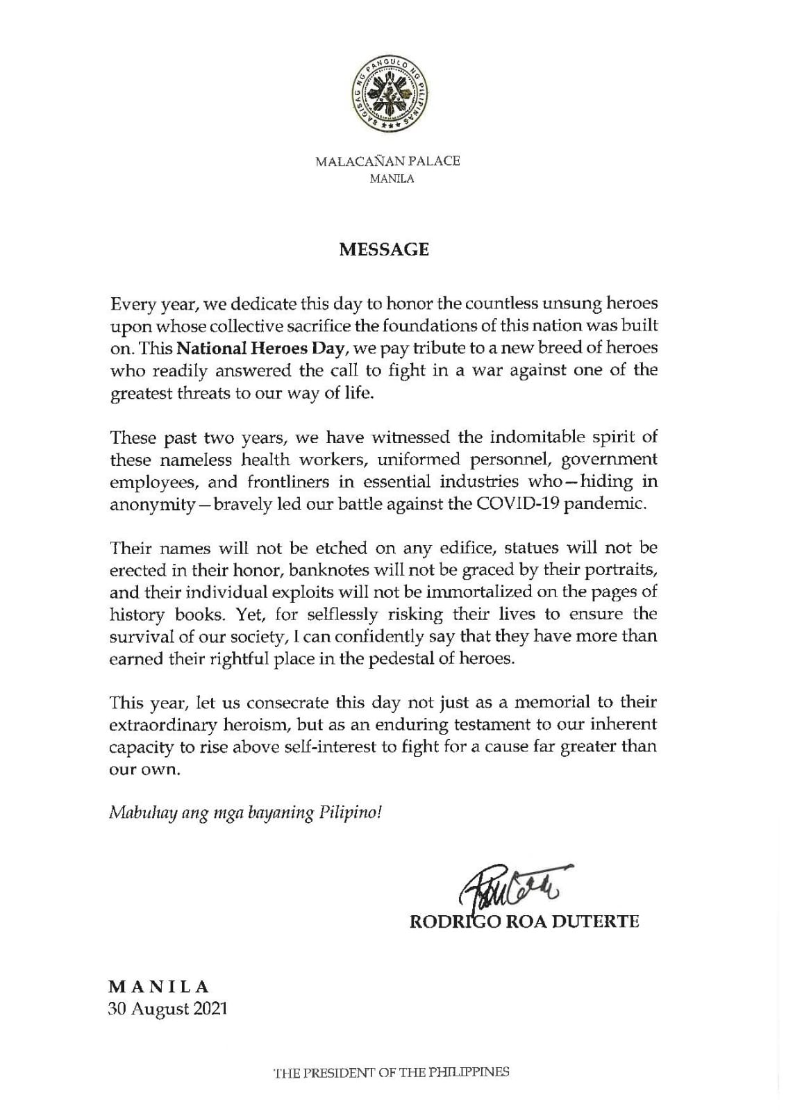 (Eagle News) — President Rodrigo Duterte hailed COVID-19 frontliners in his National Heroes’ Day message, noting their bravery in leading the country amid the COVID-19 pandemic.