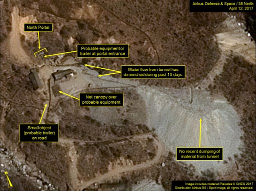 North Korea is ready to launch a nuclear test at its Punggye-ri Nuclear Test Site, the 38 North monitoring group reported on April 12, 2017. “Commercial satellite imagery of North Koreas Punggye-ri Nuclear Test Site from April 12 shows continued activity around the North Portal, new activity in the Main Administrative Area, and a few personnel around the sites Command Center,” the North Korea-related analysis website said. / AFP PHOTO