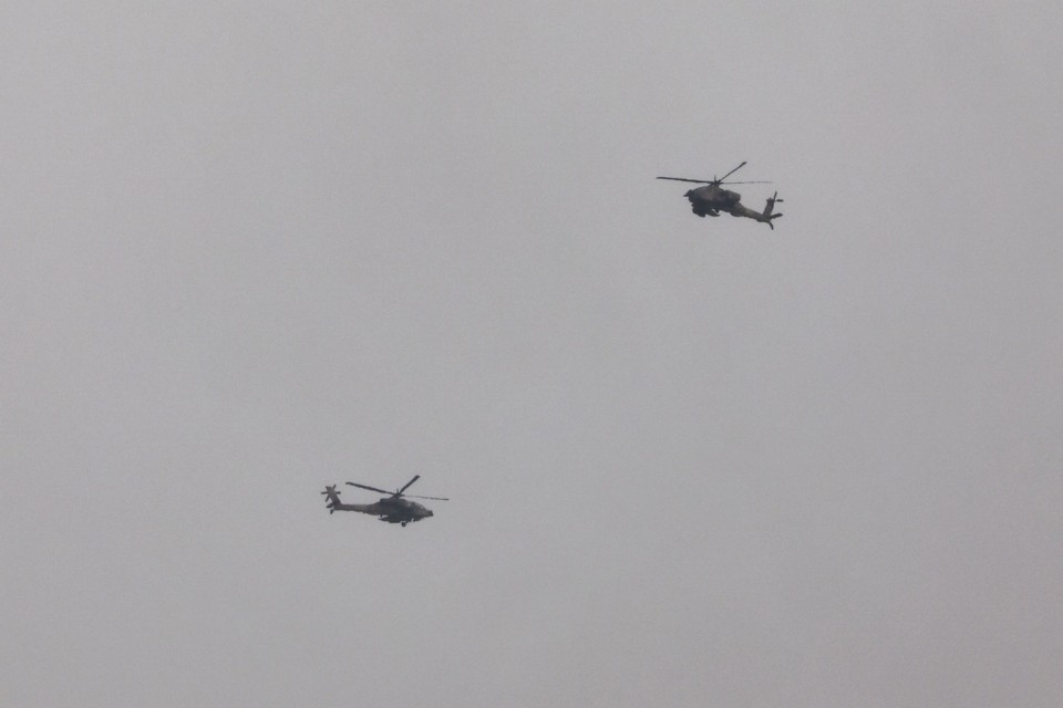 Israeli Apache helicopters fly overhead at the border with the Gaza Strip in southern Israel on October 9, 2023. Israel continued to battle Hamas fighters on October 9 and massed tens of thousands of troops and heavy armour around the Gaza Strip after vowing a massive blow over the Palestinian militants’ surprise attack. (Photo by JACK GUEZ / AFP)