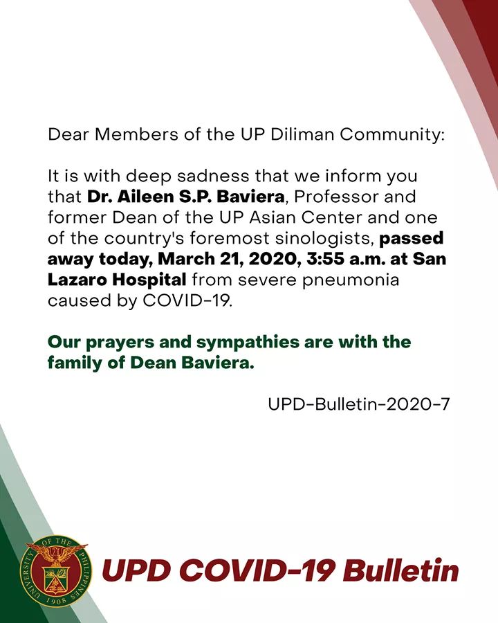 In an advisory, UP Diliman said Dr. Aileen S.P. Baviera, one of the country’s foremost sinologists, died in the San Lazaro hospital at 3:55 a.m. today.