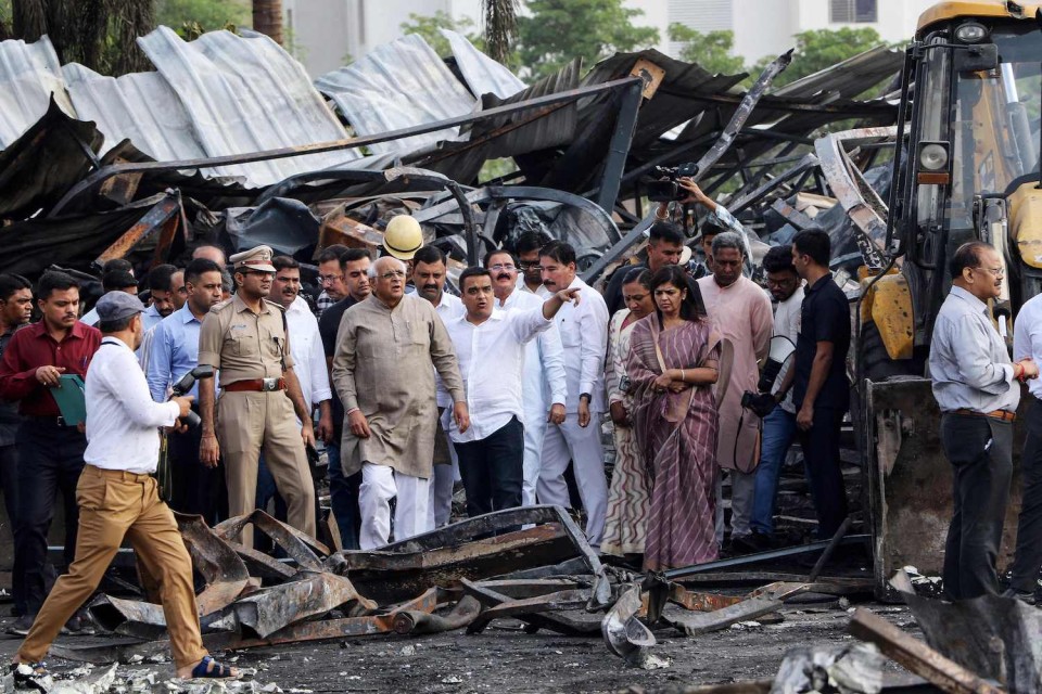Bhupendrabhai Patel (11L), Chief Minister of India’s Gujarat state speaks to an official as he inspects the site of a fire accident on the following day of the disaster, at an amusement park facility in Rajkot, on May 26, 2024. The death toll from a fire that broke out at a packed amusement and entertainment venue in western India has risen to 27, including four children under the age of 12, local reports said on May 26. (Photo by AFP)