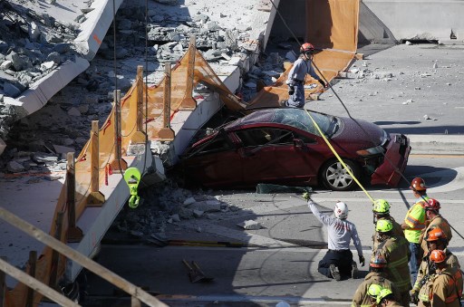 MIAMI, United States (AFP) — A newly installed pedestrian bridge over a major road in Miami collapsed on Thursday, killing four people and trapping multiple cars below.
