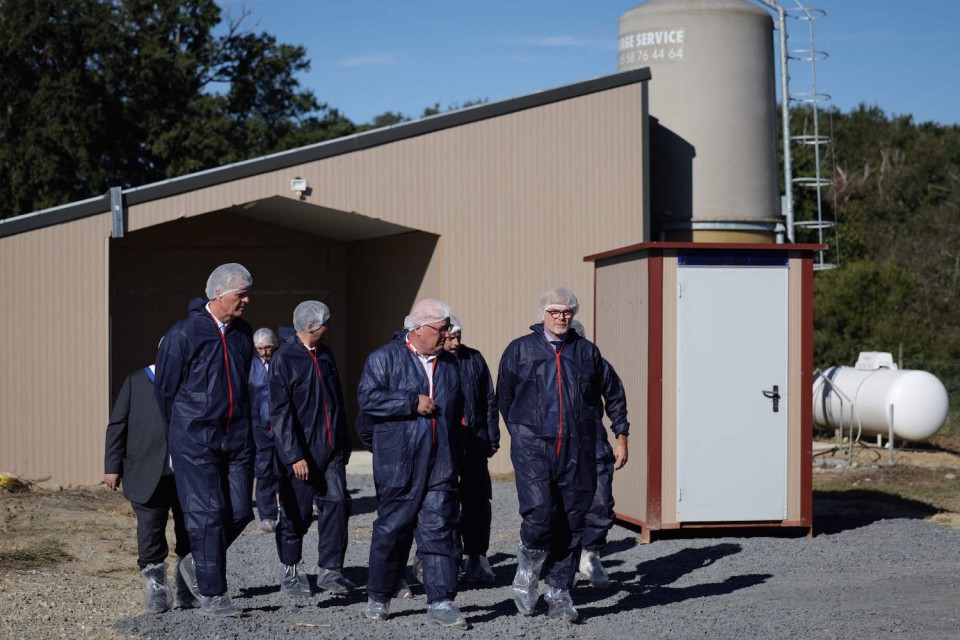 French Agriculture Minister Marc Fesneau (R), flanked by Bernard Malabirade (2nd R), president of the local house of agriculture, and other officials, exit a building housing ducks at the GAEC (joint farming group) of Paillet, during his visit to launch a mainly state-funded national vaccination campaign against avian influenza, in Labarthete, southwestern France, on October 2, 2023. (Photo by Valentine CHAPUIS / AFP)