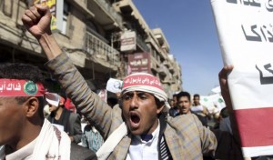 A protester gestures during a demonstration against satirical French weekly Charlie Hebdo, which featured a cartoon of the Prophet Mohammad as the cover of its first edition since an attack by Islamist gunmen, in front of the French embassy in Sanaa January 17, 2015. REUTERS/Mohamed al-Sayaghi
