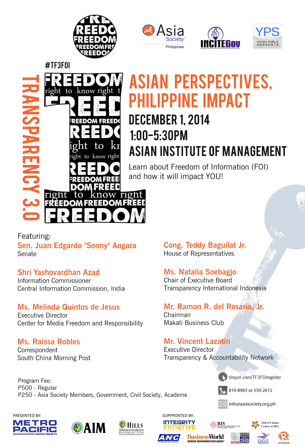 Transparency 3.0 Freedom of Information: Asian Perspectives, Philippine Impact is presented by Metro Pacific Investments, Asian institute of Management, HILLS Program on Governance and supported by Integrity Initiative, and ASEAN-India Centre at RIS. ANC, BusinessWorld, Eagle Broadcasting Corporation, Rappler, and DZAR Sonshine Radio are media partners for this event.