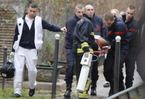 Firefighters carry a victim on a stretcher at the scene after a shooting at the Paris offices of Charlie Hebdo, a satirical newspaper, January 7, 2015. REUTERS/Jacky Naegelen