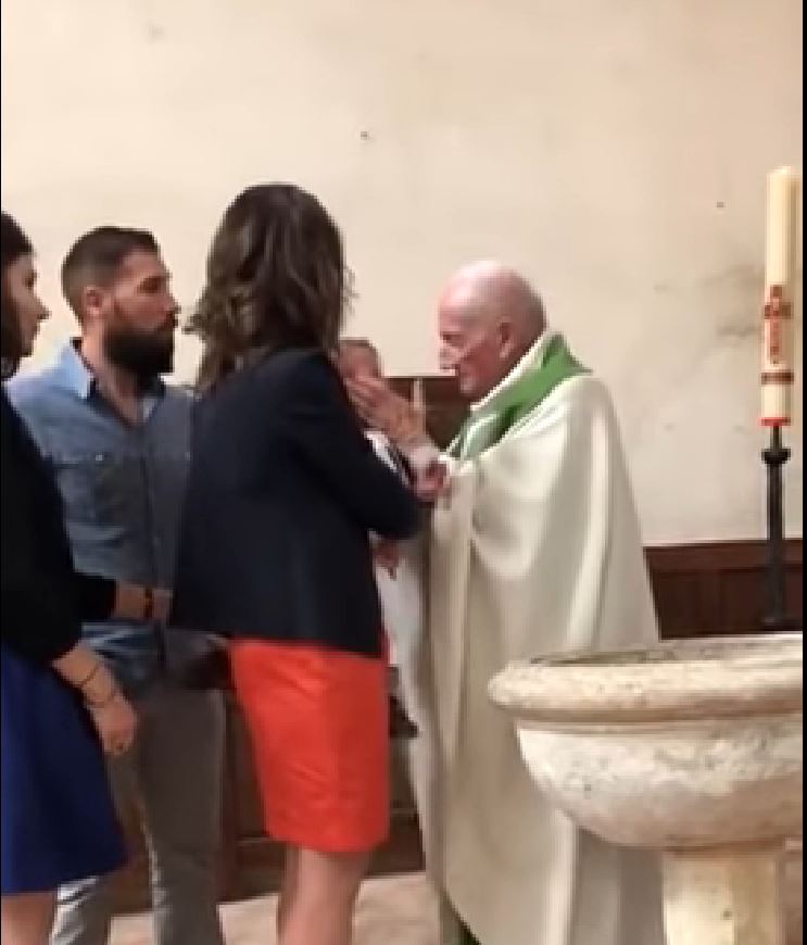 The baby’s parents, visibly shocked, eventually manage to extricate the child from the priest’s grip during the ceremony in Champeaux, about 50 kilometers (30 miles) southeast of Paris.