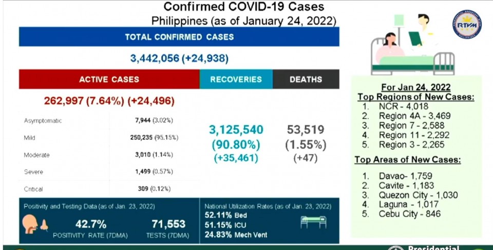 Duque said that Metro Manila or the National Capital Region still topped the regions with the highest contribution in terms of number of cases, followed by Region 4-A or Calabarzon, and Region 7 or Central Visayas region. This was for the January 24 data.