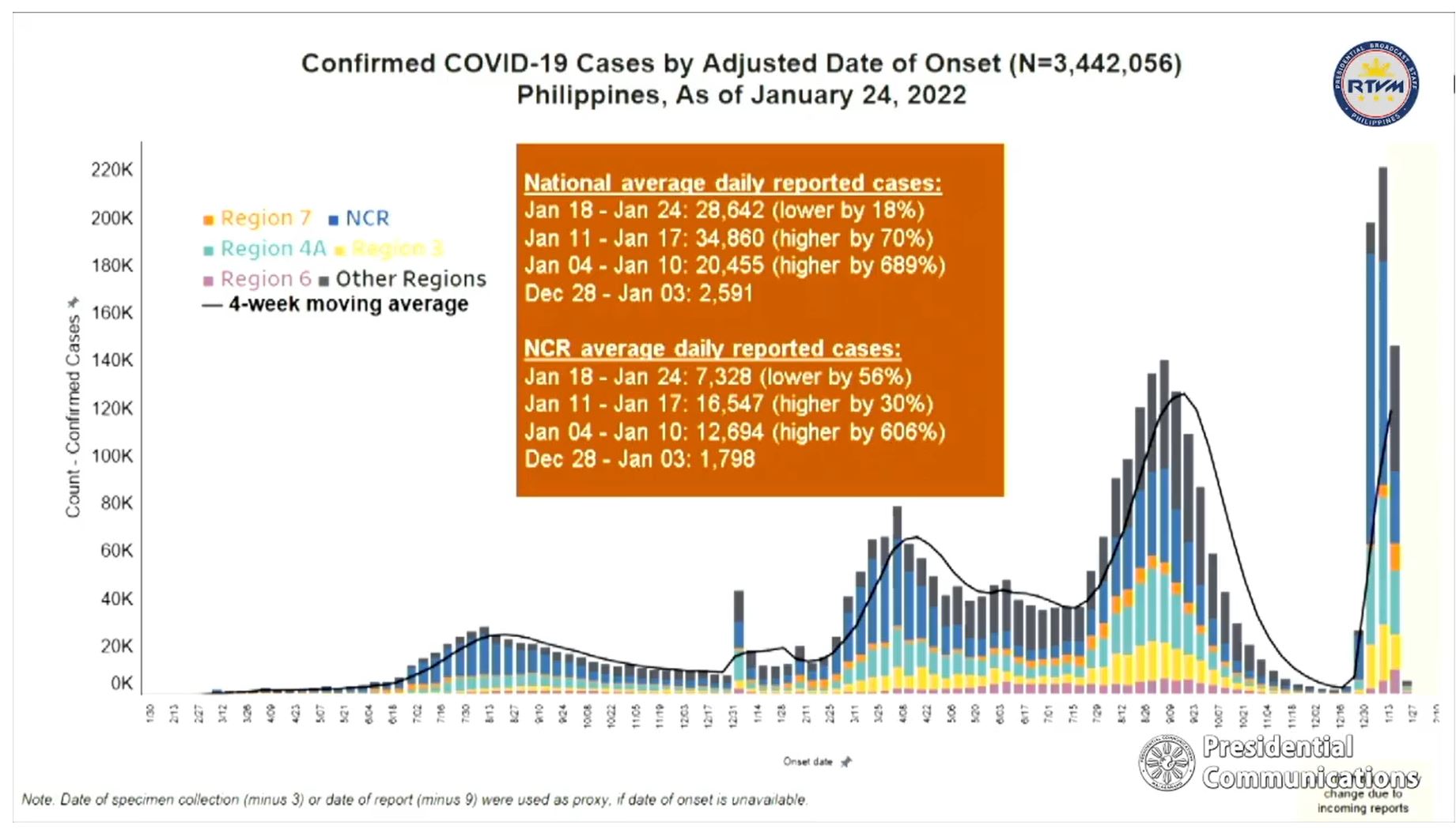 From January 18 to 24, the average daily reported number of cases is 7,328. This is lower by 56 percent compared to the average daily reported number of cases the previous week at 16,547.