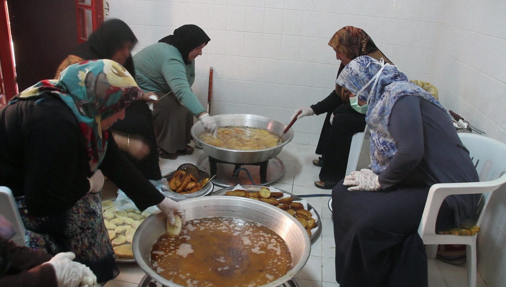 Seated in circles on the tiled floor, the women chop meat and vegetables for pies while chanting battle cries and constant songs of praise to Allah.