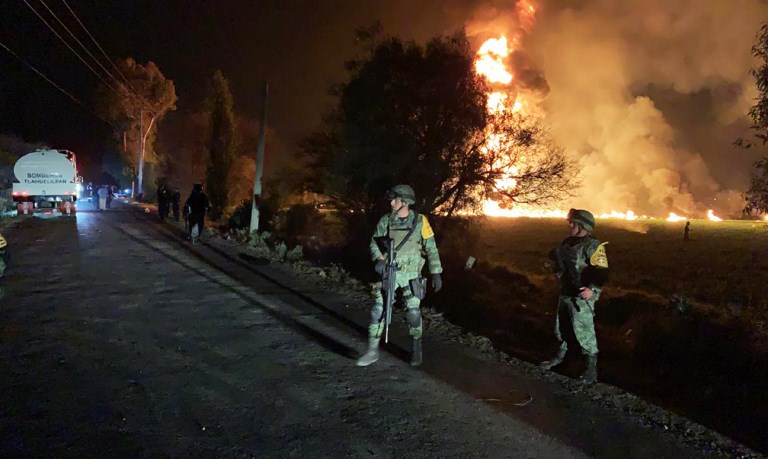 This handout photo distributed by the Mexican Secretary of National Defence (Secretaria de Defensa Nacional) shows Mexican soldiers standing guard near a fire after a leaking gas pipeline triggered a blaze in Tlahuelilpan, Hidalgo state, on January 18, 2019. – A leaking fuel pipeline triggered a massive blaze in central Mexico, killing at least 20 people and injuring another 54, officials said. Omar Fayad, governor of Hidalgo state, said locals at the site of the leak were scrambling to steal some of the leaking oil when at least 20 of them were burned to death. (Photo by Handout / SECRETARIA DE DEFENSA NACIONAL / AFP)