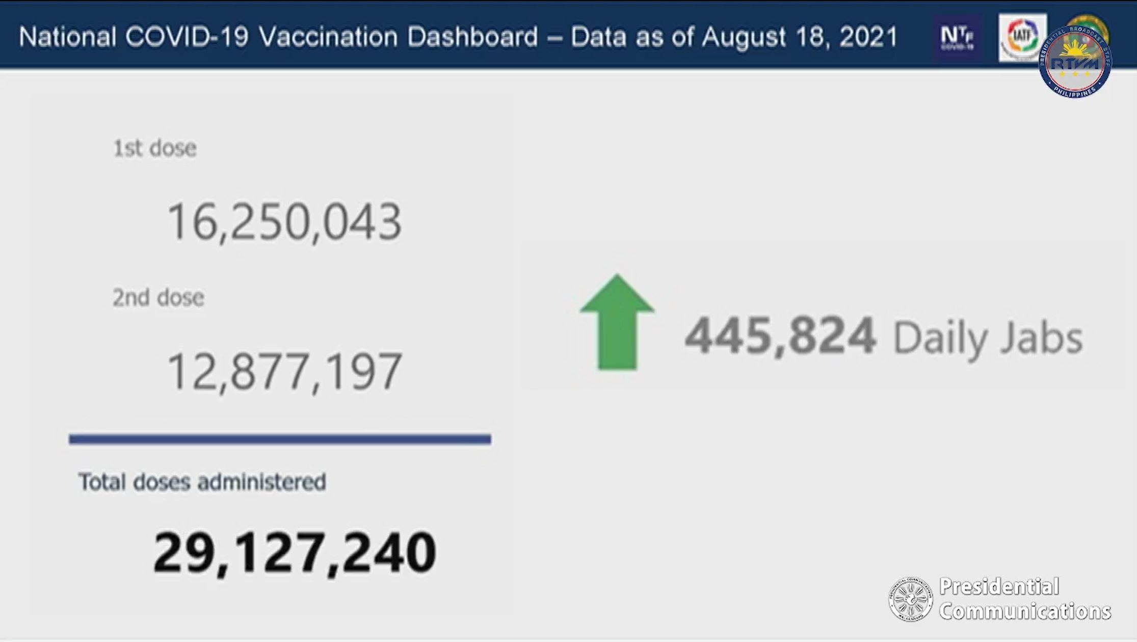 Presidential Spokesperson Harry Roque said that as of Wednesday, Aug. 18, the total doses administered have reached 29,127,240. Those fully vaccinated have reached 12,877,197, while those who only received the first dose were 16,250,043.