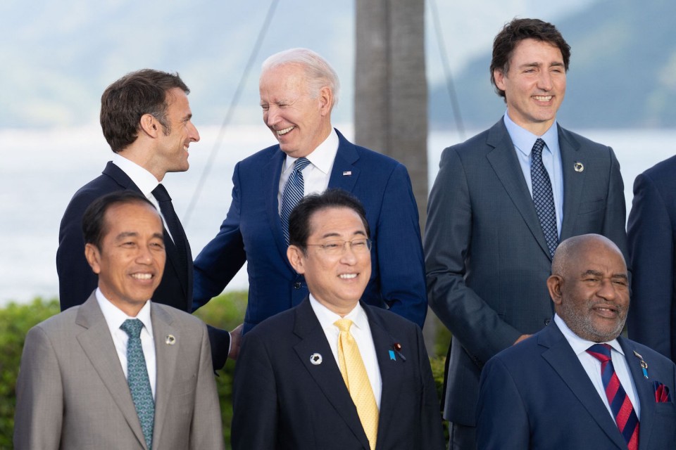 France’s President Emmanuel Macron (L) speaks with US President Joe Biden during a family photo of leaders of the G7 and invited countries during the G7 Leaders’ Summit in Hiroshima on May 20, 2023. (Photo by Stefan Rousseau / POOL / AFP)
