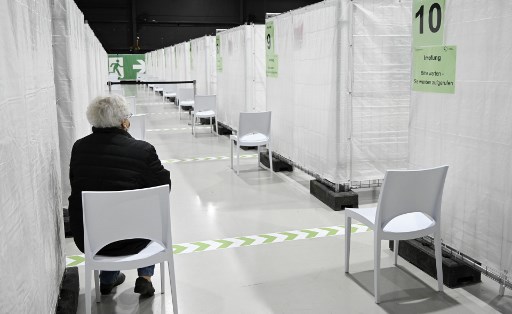 An elderly woman waits to be called for receiving the Pfizer-BioNTech Covid-19 vaccine at the regional corona vaccination centre in Ludwigsburg, southern Germany, on January 22, 2021. (Photo by THOMAS KIENZLE / AFP)
