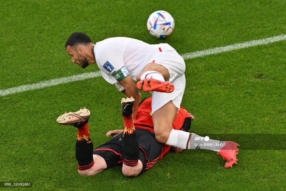 Belgium’s midfielder #07 Kevin De Bruyne (L) and Morocco’s defender #06 Romain Ghanem Saiss fight for the ball during the Qatar 2022 World Cup Group F football match between Belgium and Morocco at the Al-Thumama Stadium in Doha on November 27, 2022. (Photo by Glyn KIRK / AFP)