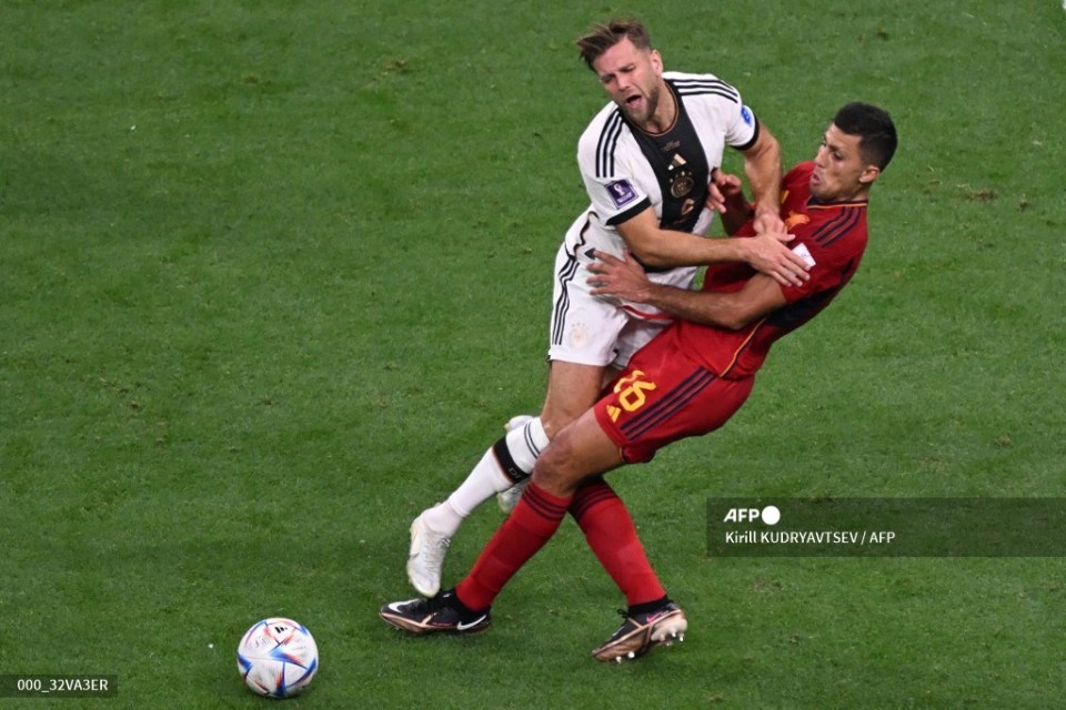 Germany’s forward #09 Niclas Fullkrug and Spain’s midfielder #16 Rodri collide during the Qatar 2022 World Cup Group E football match between Spain and Germany at the Al-Bayt Stadium in Al Khor, north of Doha on November 27, 2022. (Photo by Kirill KUDRYAVTSEV / AFP)