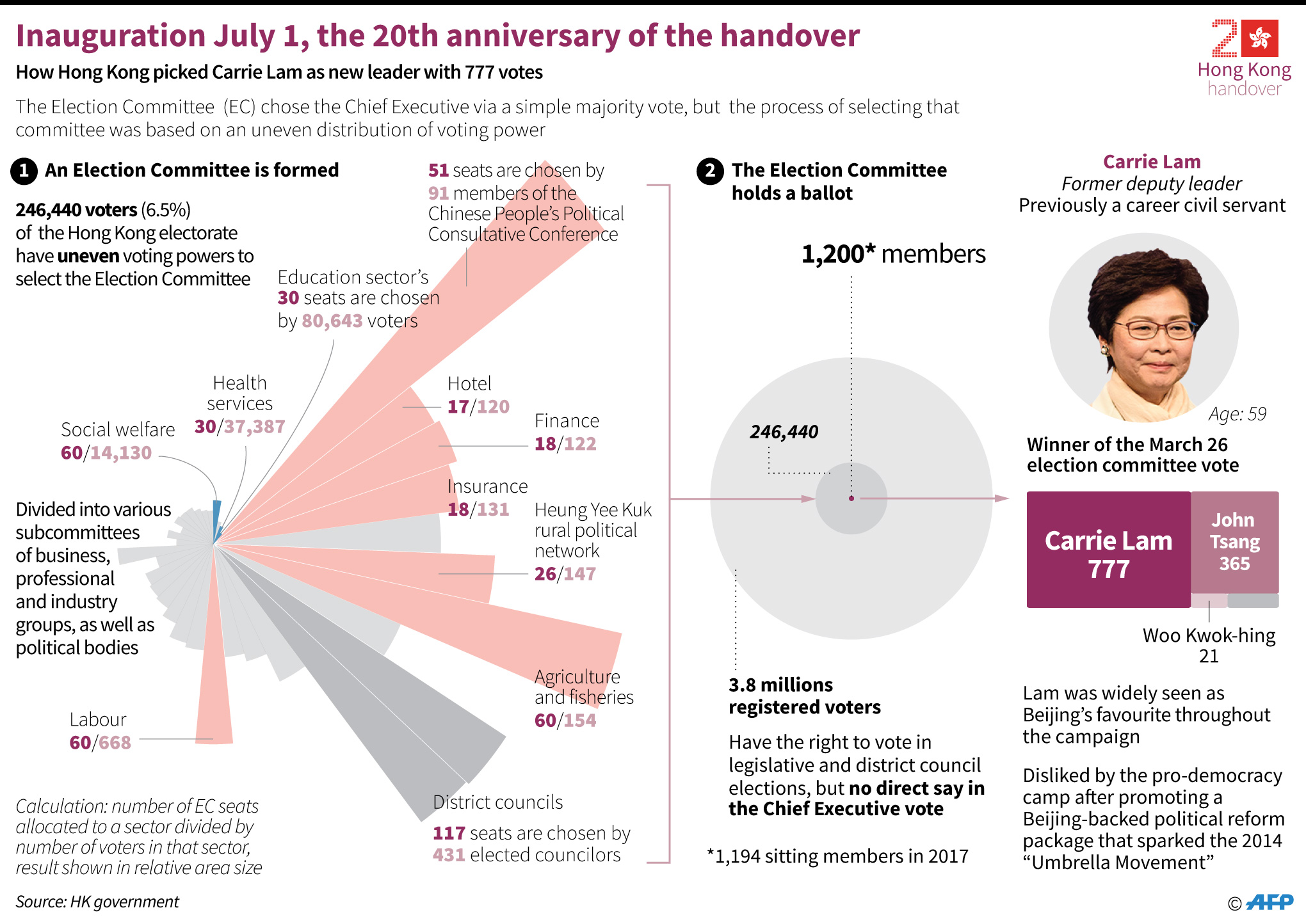 Infographic about how Hong Kong picked their new leader Carrie Lam, with 777 votes from the Election Committee.