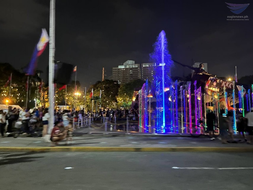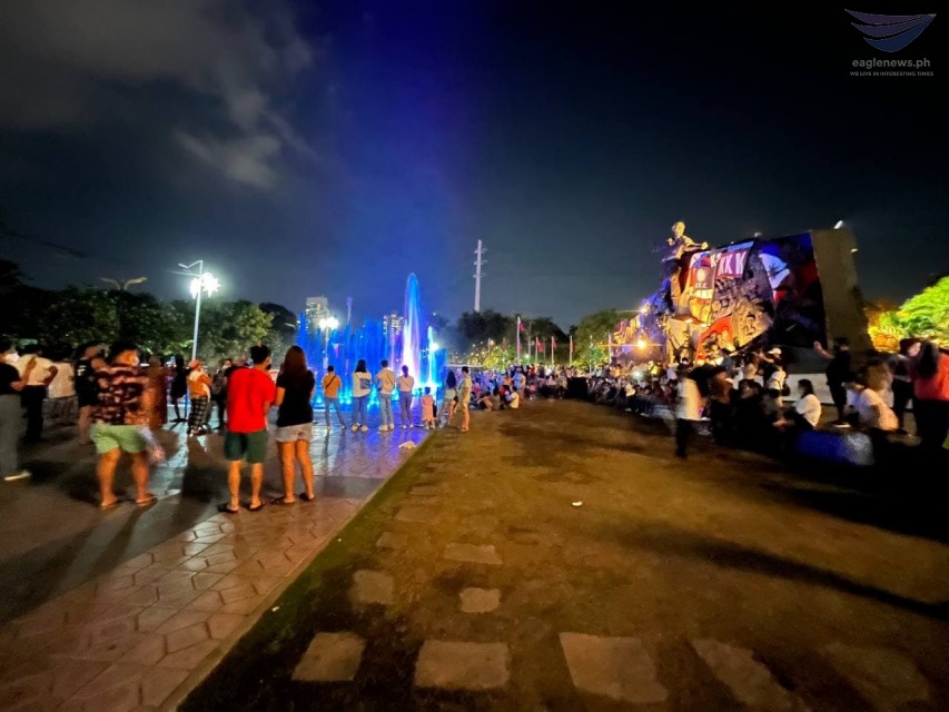 People enjoying the scene as the musical dancing fountain in front of the Bonifacio Shrine in Ermita, Manila is in full splendor during the commemoration of the 158th birth anniversary of Andres Bonifacio on Tuesday, Nov. 30, 2021 (Photo by Carmie Hufano/NEU-COC/photo contributed to Eagle News Service)