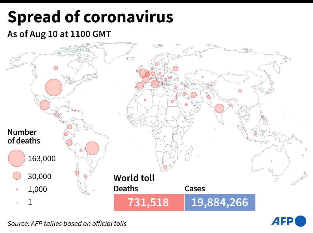 PARIS, France (AFP) — More than 20 million coronavirus cases have been now been registered across the world, over half in the Americas, according to an AFP tally of official sources at 2215 GMT on Monday.