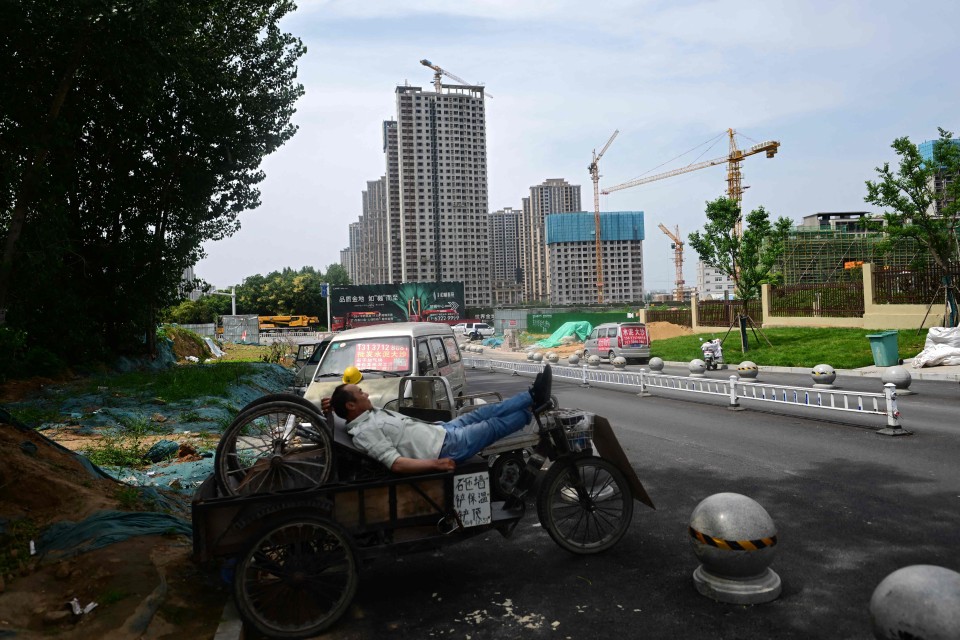 A man rests on a tricycle in front of an under construction housing complex in Xinzheng City in China’s central Henan province on June 20, 2023. (Photo by Pedro PARDO / AFP)