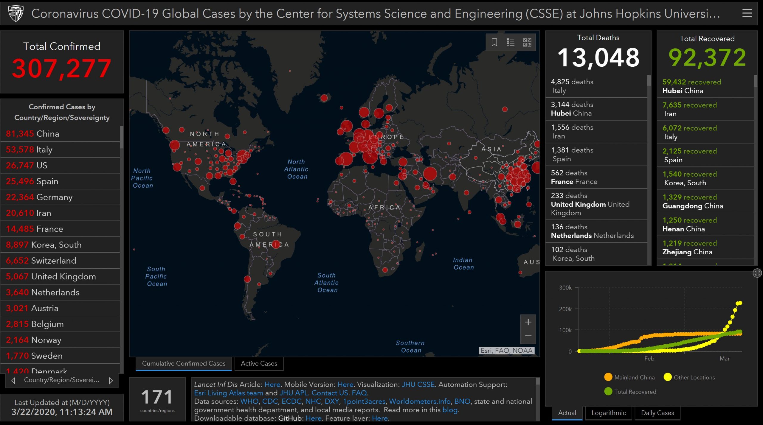 (Eagle News) – Deaths due to the coronavirus worldwide had gone past 13,000 as total confirmed cases rose to more than 307,000, according to the latest statistics on the global cases collated by the Johns Hopkins University (JHU).