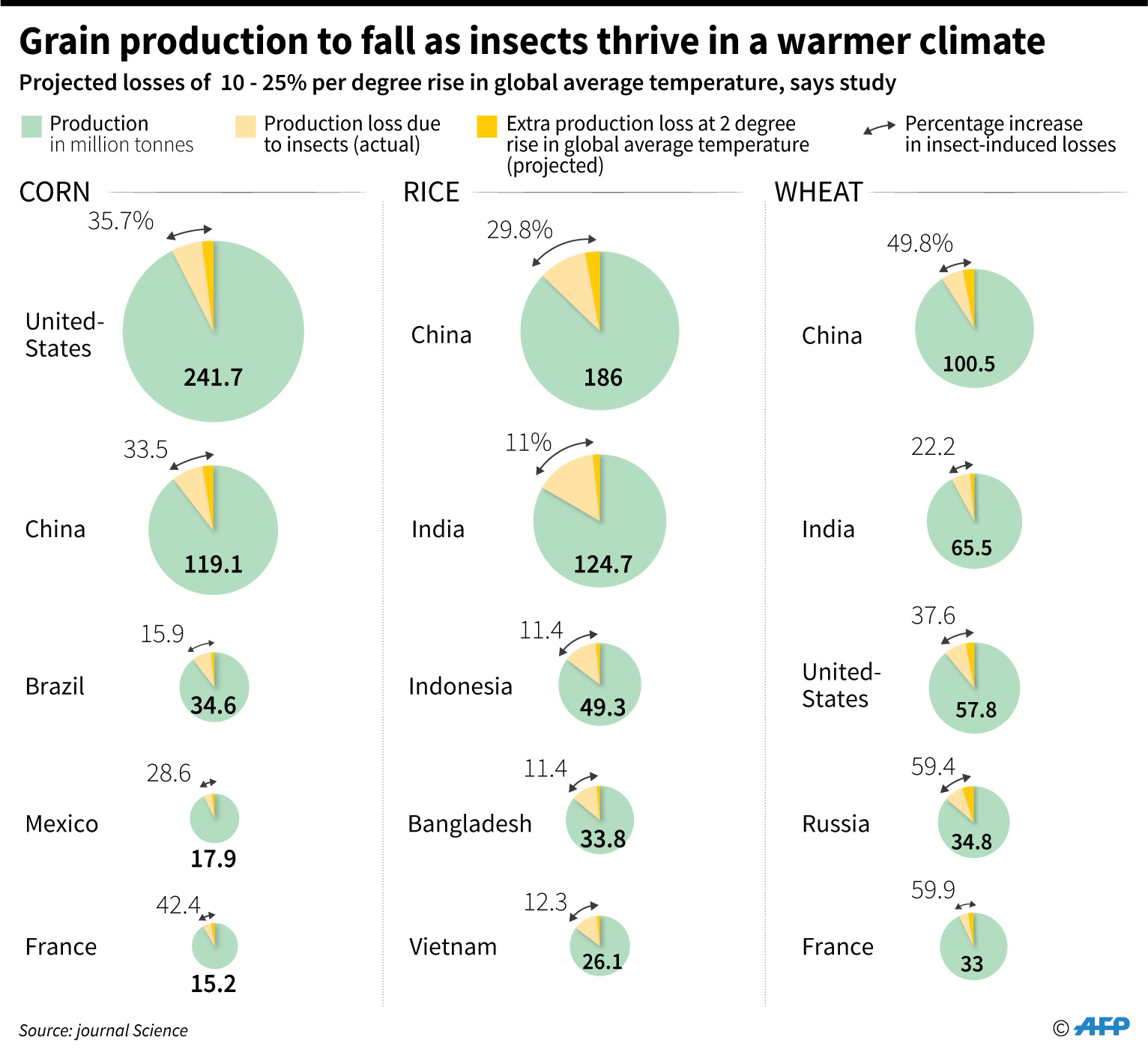 France stands to lose about 9.4 percent of its maize to pests in a world that is 2 C warmer, compared to about 6.6 percent of yield losses today due to pests.