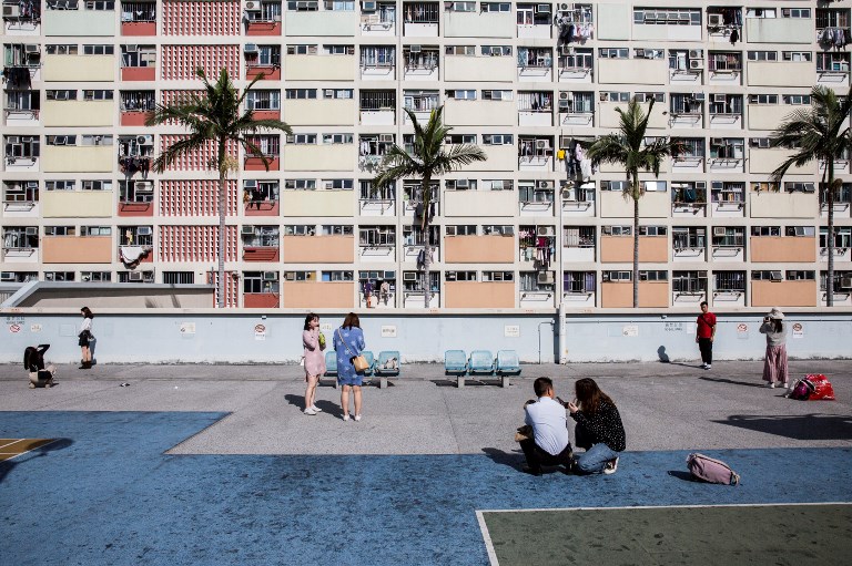 This picture taken on January 20, 2019 shows people sitting on a basketball court at a popular Instagram spot in Hong Kong. – For smartphone-wielding hordes of tourists, Hong Kong boasts a host of must-have Instagram locations — but crowds of snap-happy travellers are testing local patience and transforming once quaint pockets of the bustling metropolis. (Photo by Isaac LAWRENCE / AFP)