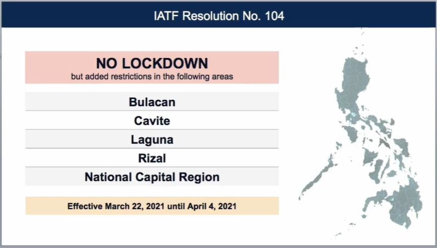 This was after the Inter-Agency Task Force for the Management of Emerging Infectious Diseases approved Resolution No. 104 that imposed the additional restrictions also on Bulacan, Cavite, Laguna, and Rizal–which, together with the National Capital Region, were described as one subject area in the resolution—from Monday, March 22, to Sunday, April 4.