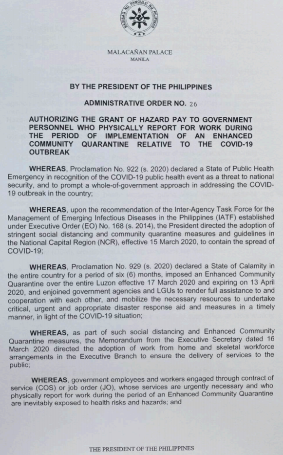 Administrative order number 26 signed by President Rodrigo Duterte on Monday, March 23, said the hazard pay covers national government agencies including state universities and colleges and government-owned and controlled corporations.